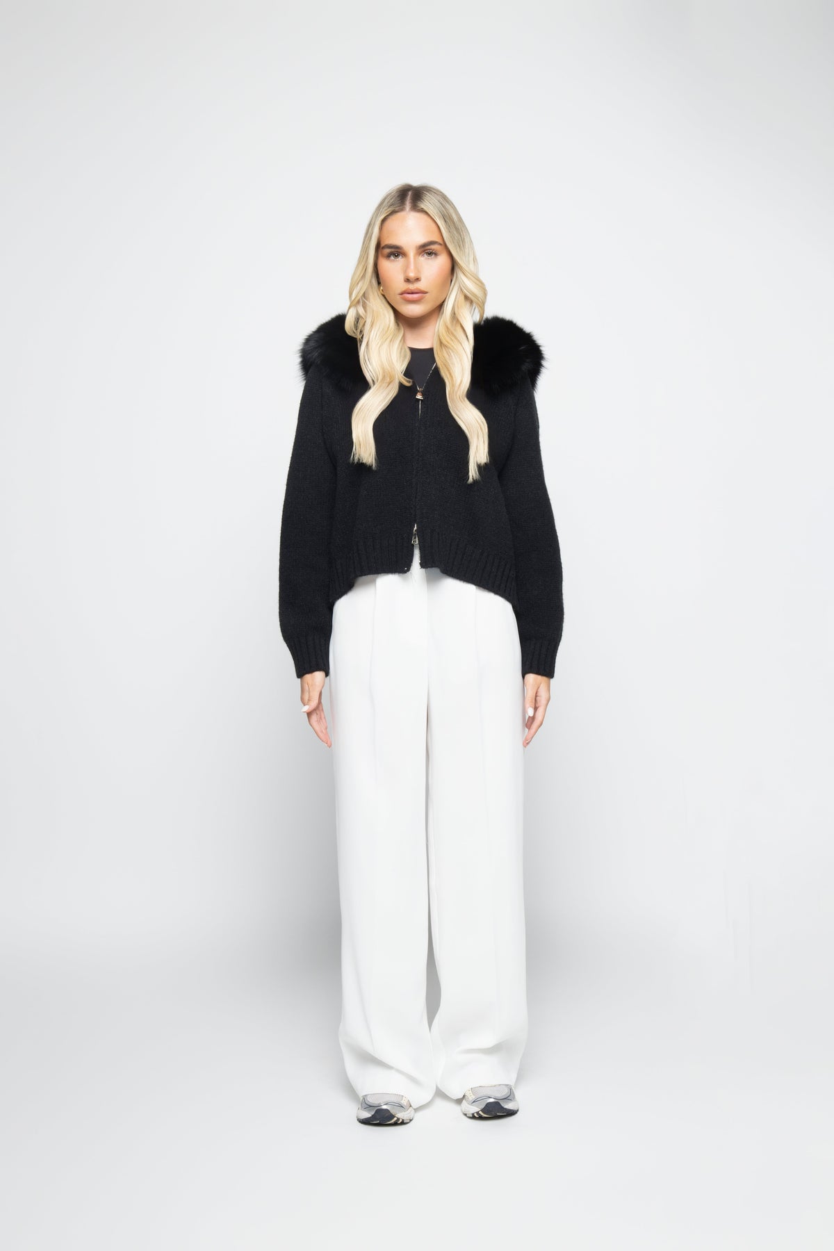 Crafted from a premium wool blend, it features a front zip closure and a detachable hood trimmed with soft faux fur, giving you endless styling possibilities. Whether worn loose for a relaxed, oversized fit or cinched at the waist with the included belt, this cardigan adapts effortlessly to every occasion.