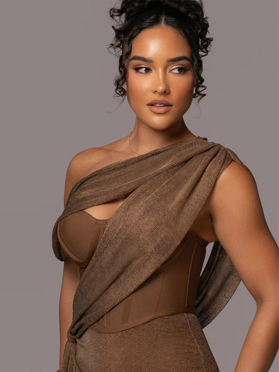This is a maxi dress with an asymmetric, one-shoulder design. It features a draped fabric detail across the torso and a structured corset bodice, paired with a body-hugging skirt. The shimmering texture creates a glamorous, red-carpet-worthy look, perfect for formal events or evening galas.